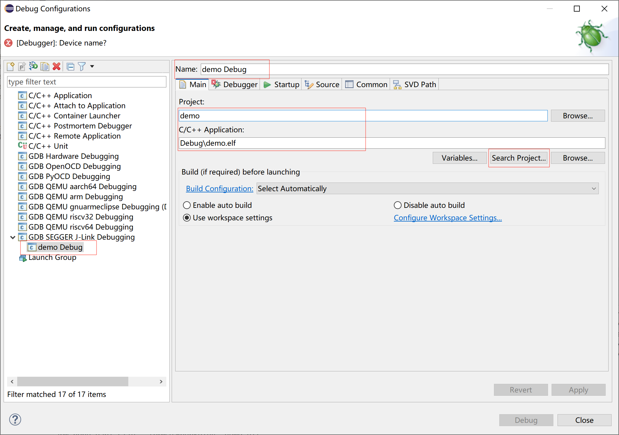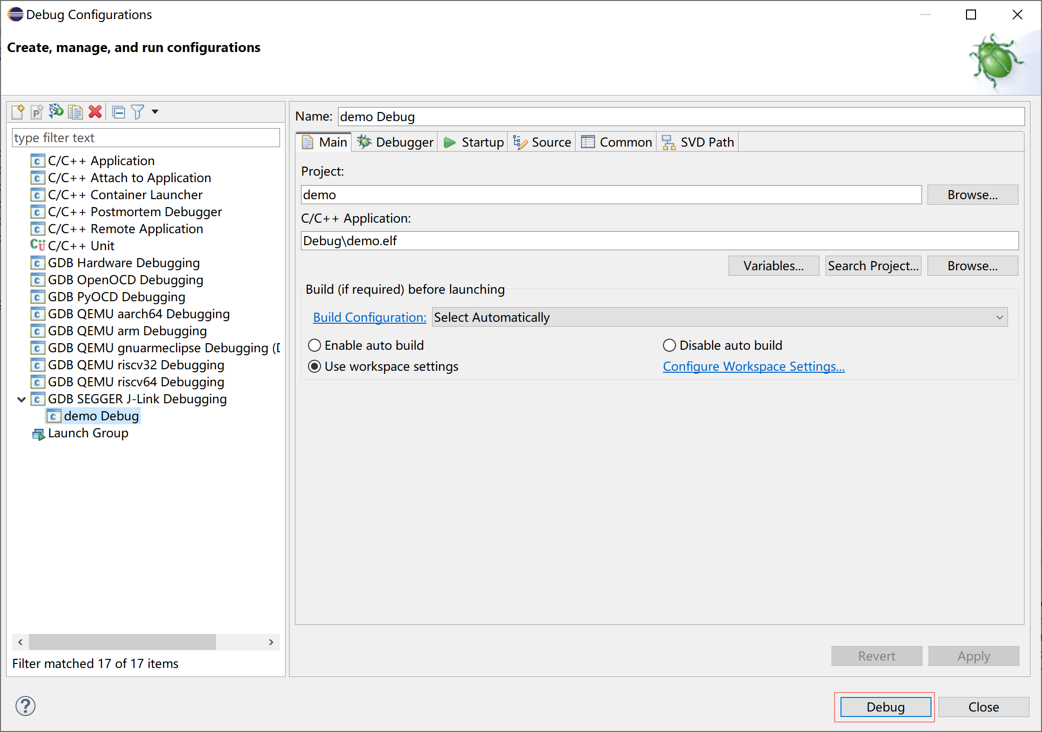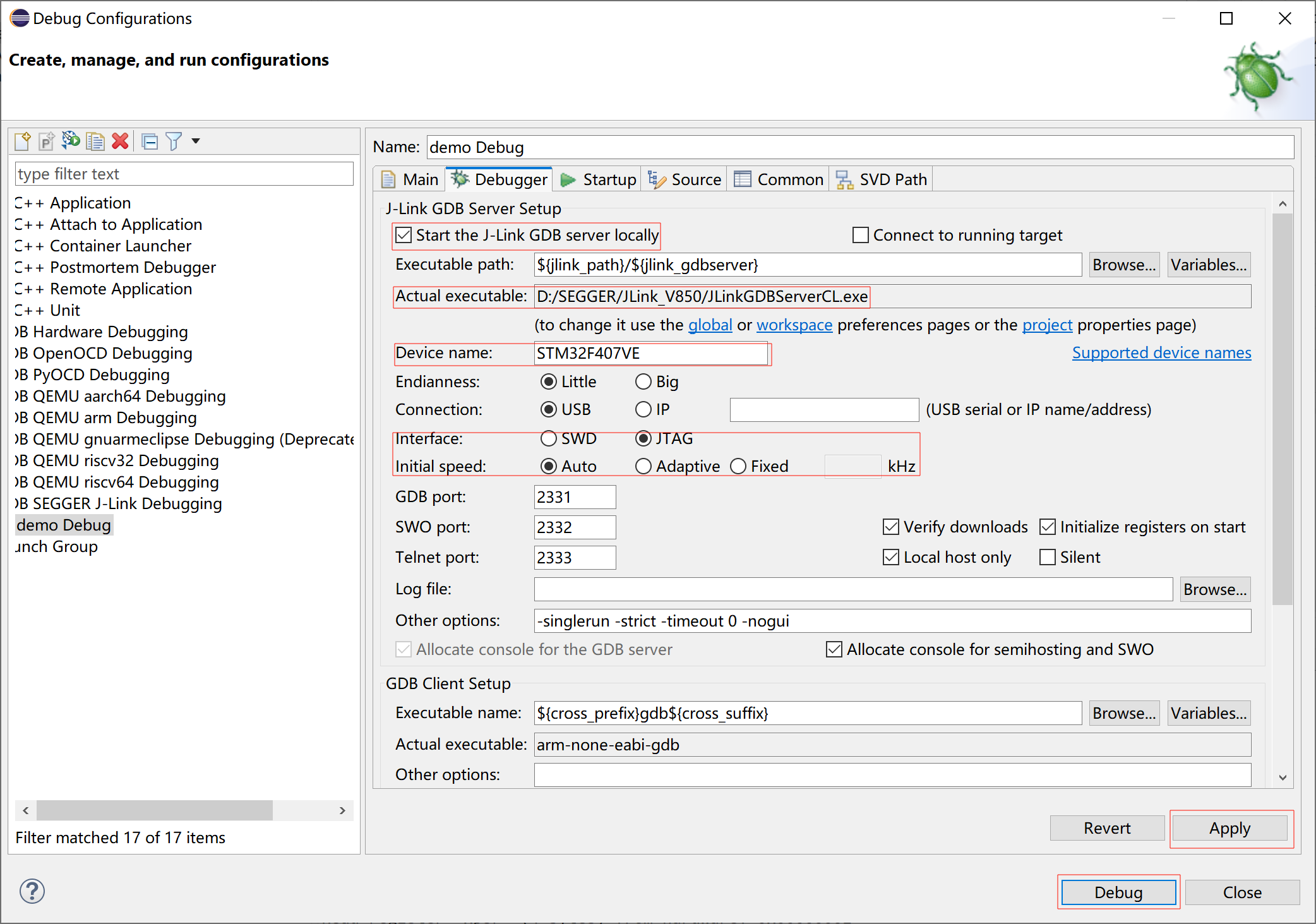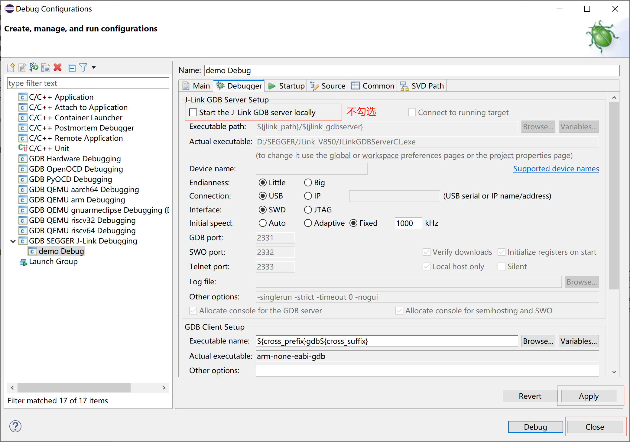 在demo Debug->Debugger中不勾选Start the J-Link GDB server locally。点击Apply,点击Close。